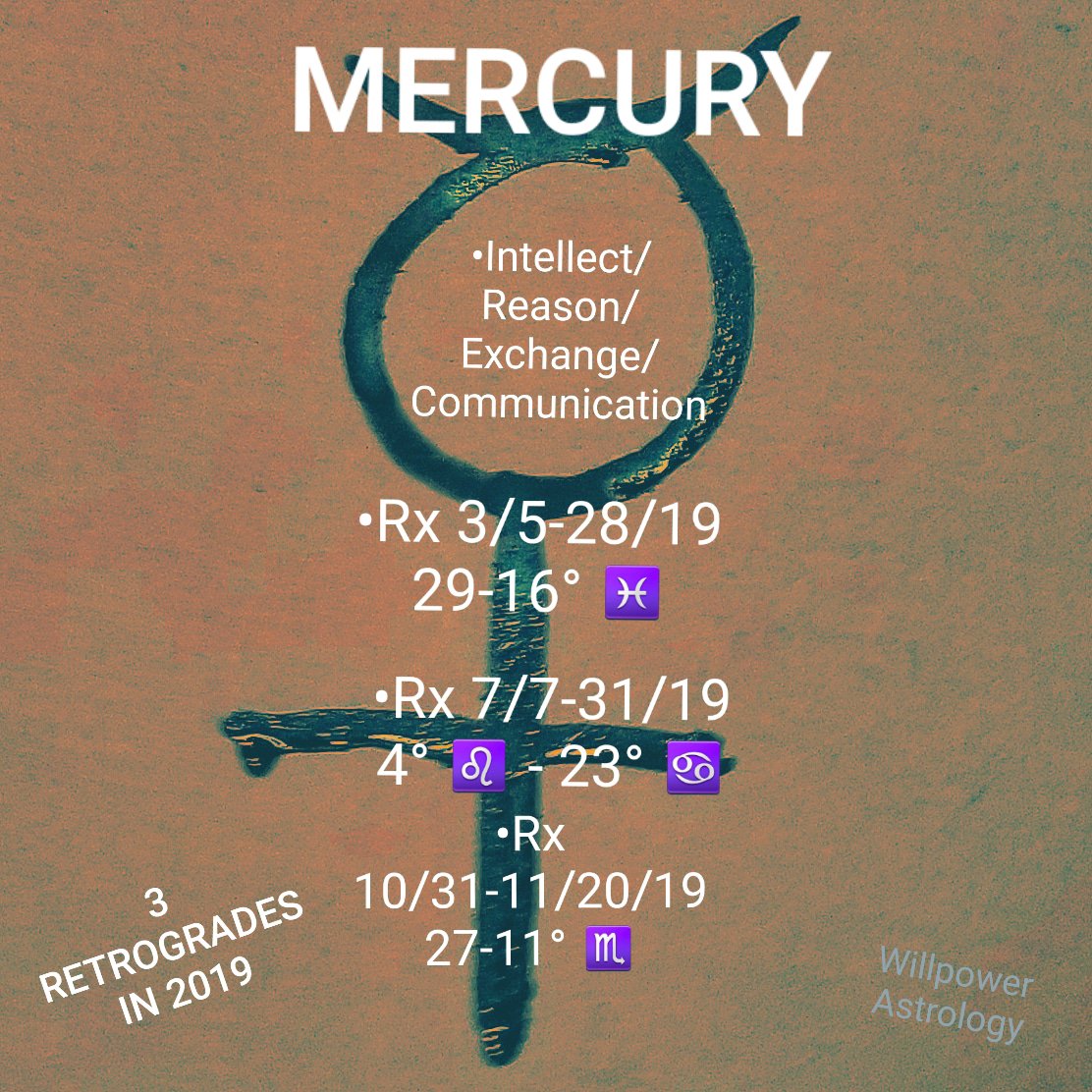 Retrograde is when a planet seems to slow down in its journey from east to west in the southern sky (northern hemisphere folks), and then move backwards for awhile. It then slows and stops again, and then proceeds forward through the same area of the sky that it had before. This process is caused by our relative orbit. The planet doesn’t actually change in its orbit. There are a bunch of interpretations for this retrograde motion, mainly that the energy of the planet goes inward/underworld for a time while we go over that area of our chart with a fine-toothed comb.